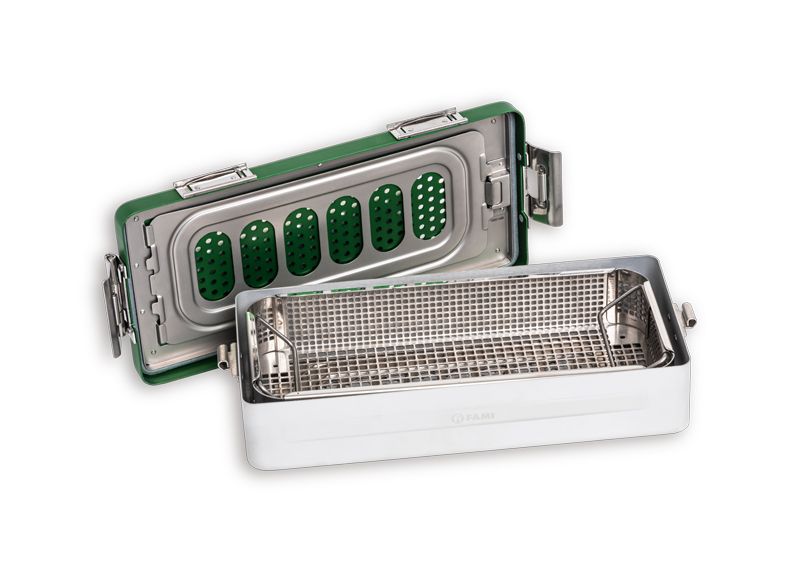Seu design compacto e perfurado garante limpeza eficaz e segurança, sendo versátil para clínicas dentárias e centros de esterilização.