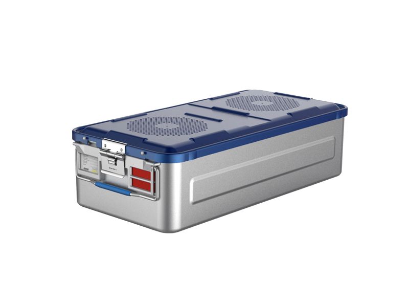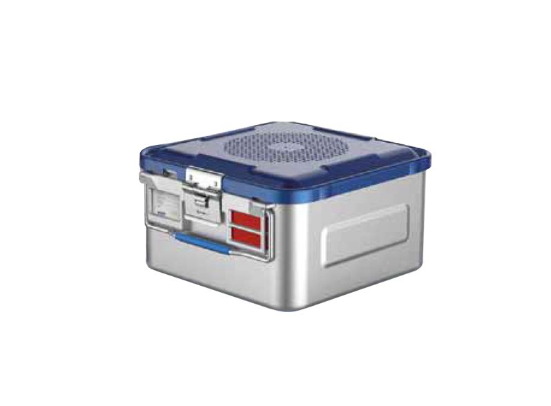 Características: Fabricados em alumínio anodizado, possuem tampas de cantos arredondados e perfurações para circulação do agente esterilizante, suas travas possuem suporte para lacre de segurança e a base tem suportes para etiquetas de documentação, facilitando a rastreabilidade.
