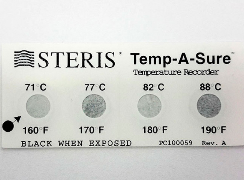 Aplicação: Indicadores químicos auto-adesivos Temp-A-Sure STERIS para avaliar a temperatura durante a termodesinfecção. Consiste em um termômetro de mudança química irreversível, que registra instantânea e permanentemente a temperatura. São fáceis de aplicar e destacar sem deixar resíduos.